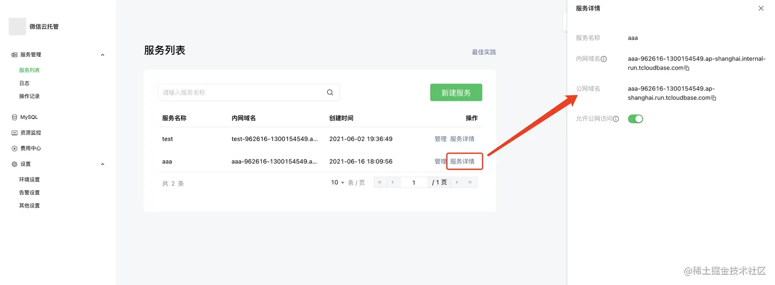 (21) 返回服务列表,在服务详情中找到公网地址,复制到浏览器打开: