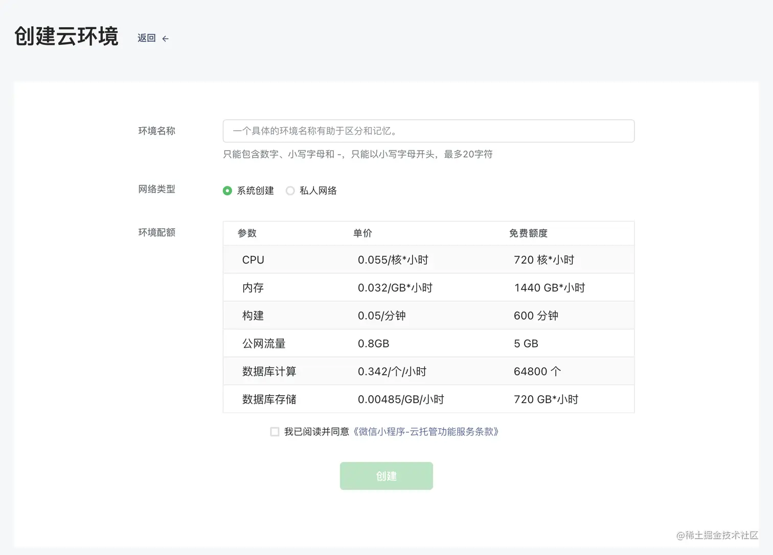 (5) 明确知悉云托管环境的费用,并同意服务条款,开始创建。