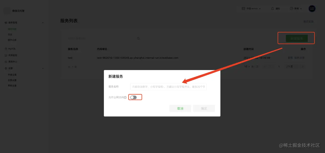 (14) 在微信云托管控制台,服务栏中,选择新建服务,如下图所示,记得勾选开启公网访问,名字随意设置(这里示例为aaa)