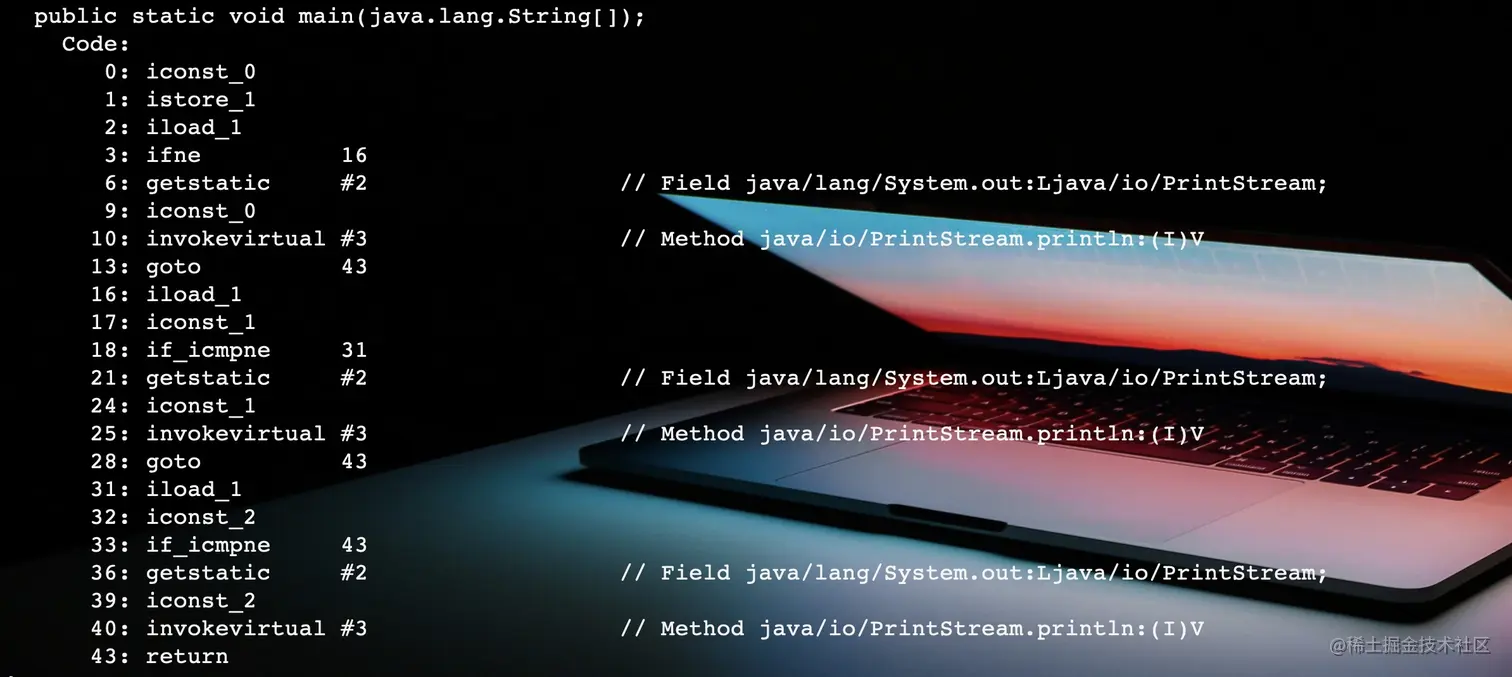 if_icmpne用于比较两个int数。从字节码也可以看出if和switch的区别:if条件和代码块的字节码是顺序的,switch条件和代码块是分开的;if自动生成goto指令,switch只有加了break才生成goto指令。