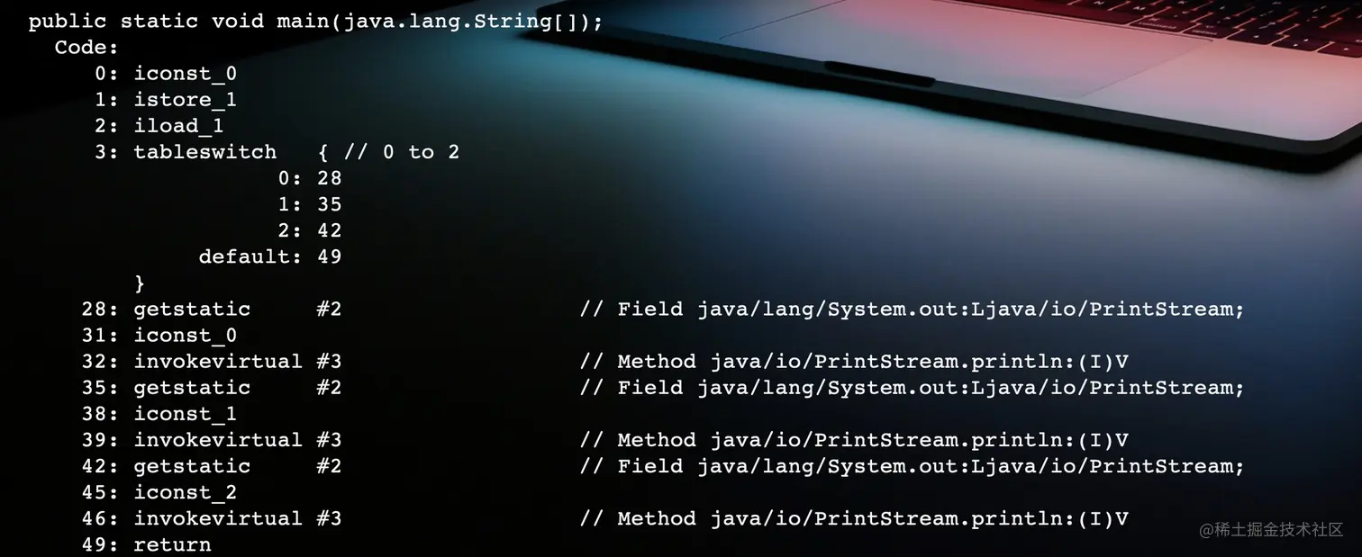 如果按照正常的思维,是不是case 0匹配之后,跳到28,执行完28、31、32输出0之后,就应该直接跳走,直接执行49。那么,这个"跳走”用字节码应该怎么表示?