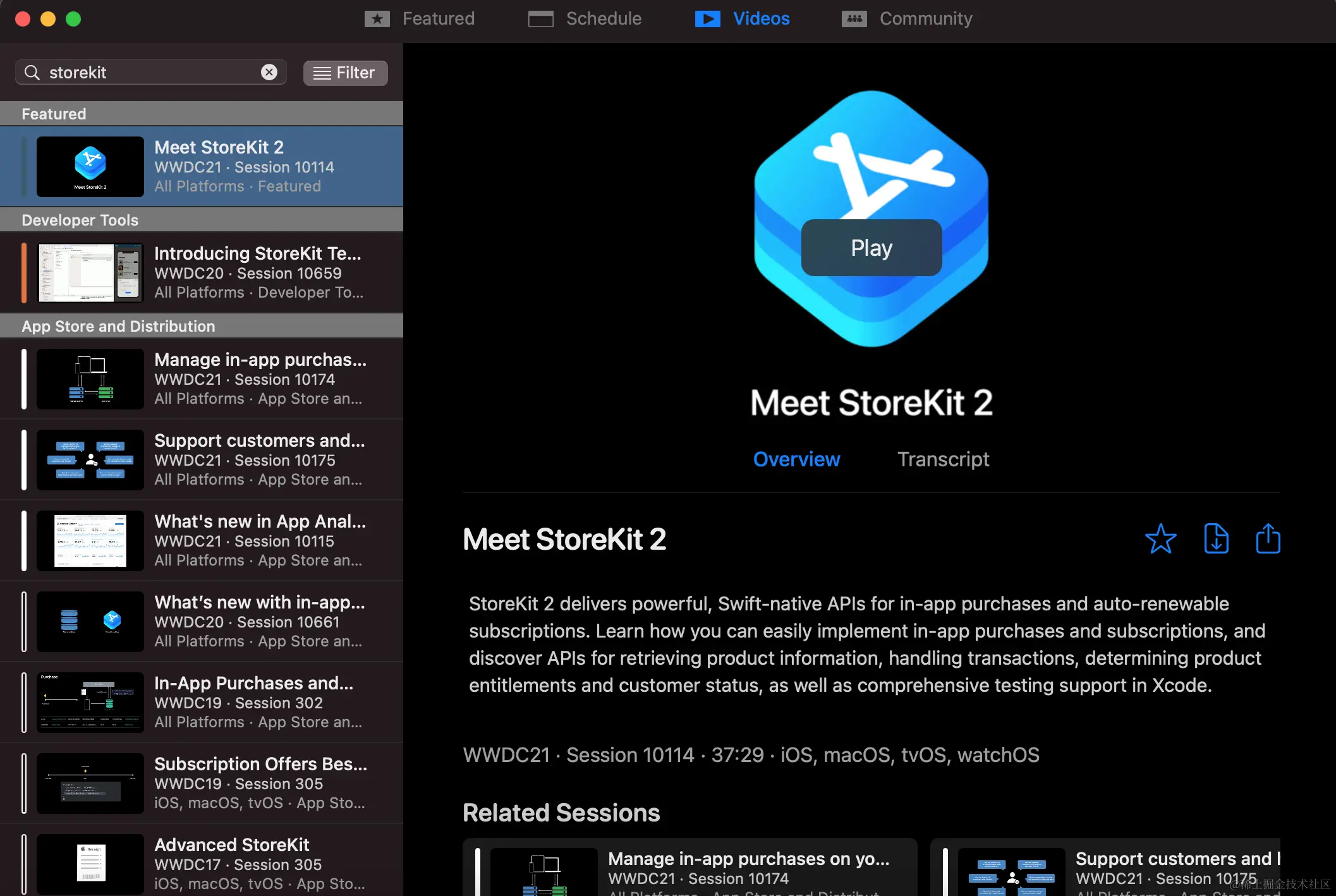 一个开源的非官方 WWDC 视频的应用,其支持视频下载、最高 5 分钟的视频切割、书签功能、iCloud 同步、Chromecast 投屏、画中画功能等等。相比于官方应用来说,其功能只多不少(官方新版的 Developer 应用添加了代码片段预览功能),而且更新比较迅速,已经发展到了 v7.3.3 版本,可以查看 2021 年的 Sessions。