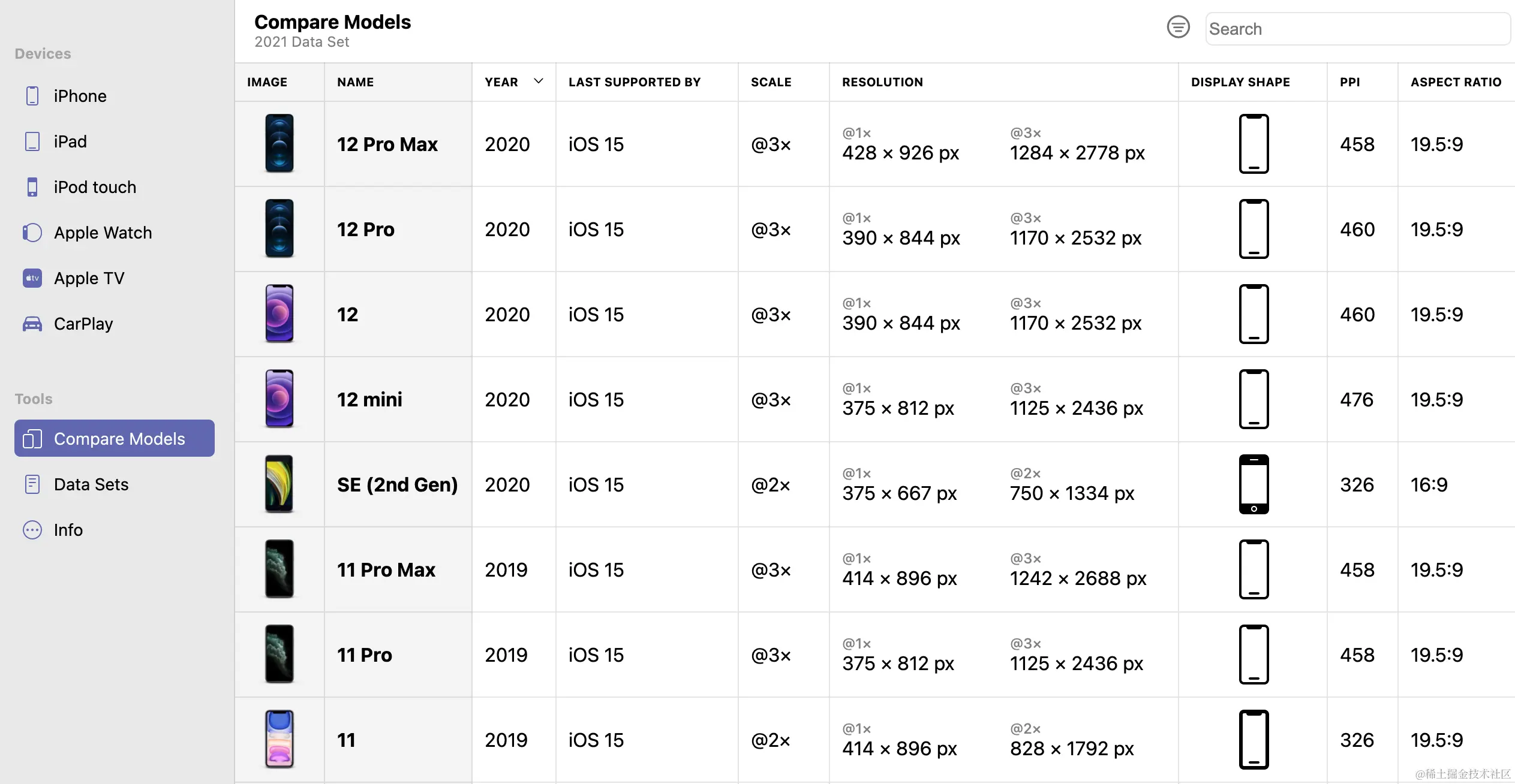 一个在线的 Apple 设备尺寸及设备内各组件的尺寸整理网站,非常之全。这里简要概括下其在 iPhone 设备包含的内容: