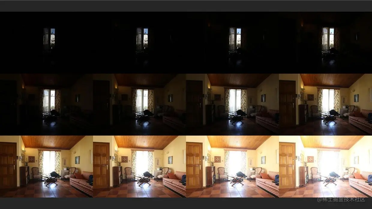 上图是我拍摄的原始照片数据,显示了其中连续 12档不同曝光的图像,最暗的可以看出外面的白墙可以被记录,最亮的那张可以看出沙发底下还是很黑,再过曝两档光圈,才可以拍到沙发下的细节。当时人眼感受比较接近倒数第二张和倒数第三张之间,但是窗外的白墙也可以毫不费力看清,不会像照片里这样有过曝的感觉。人眼对光线亮度的感受范围极大,可以很轻松跨4 个数量级,甚至更大。