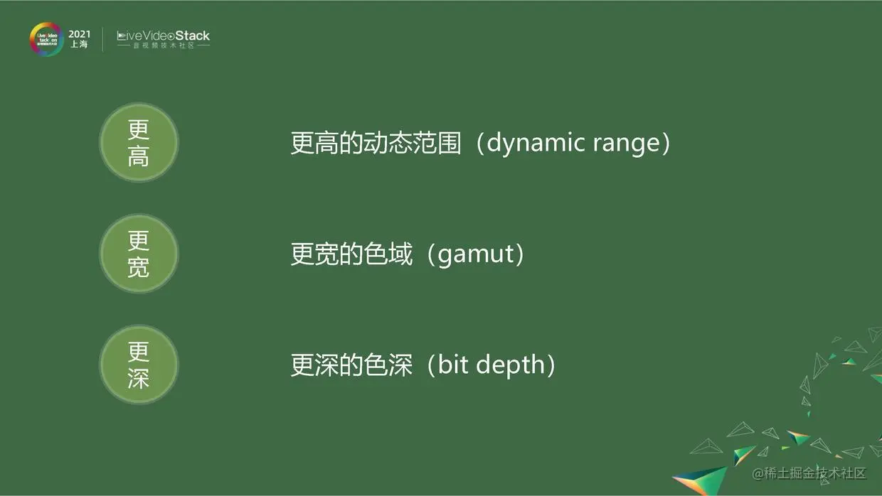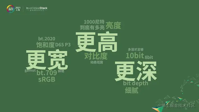 HDR视频有更高、更宽、更深的特点。我们日常的科普,为什么要用 HDR视频,就会用更高、更宽、更深来解释。但这还是太粗略了,不完整。我们大家作为技术人员,在多媒体处理领域里做专业的事应该要看得更深刻。