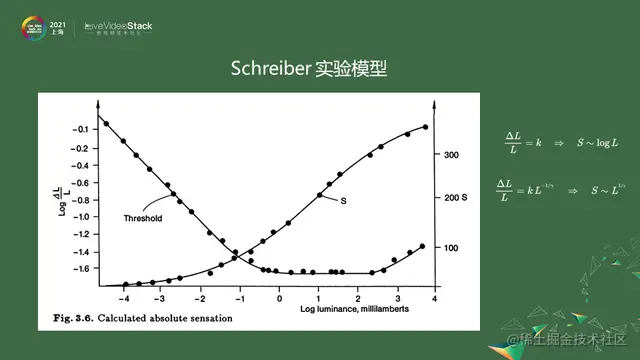 Schreiber 将数据汇总在一起,做出了他的实验模型。在上图中横坐标是以10为底的对数坐标,横坐标是0-3之间对应实际亮度是1-1000 nit,1到1000大体上是横的直线,小于1的部分是斜的直线。