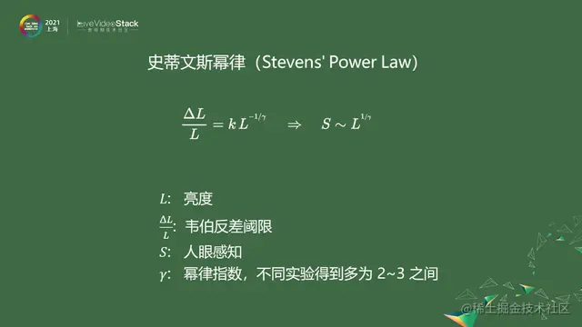 在场景更暗的区域,人眼的视杆细胞逐渐占主导,对反差的灵敏度会减小。符合史蒂文斯幂律,解方程可看出响应函数呈指数关系。gamma 是反映灵敏度相关的指数,不同的实验条件下,gamma 多在 2~3 之间。SDR 的 ITU 标准里指定的参考 CRT 显示器特性就是 gamma = 2.4。就是参照此实验定下来的参照依据。史蒂文斯幂律是在更暗的条件下符合的规律,用此规律设计编码,可以得到gamma编码,接近于现在sRGB编码。