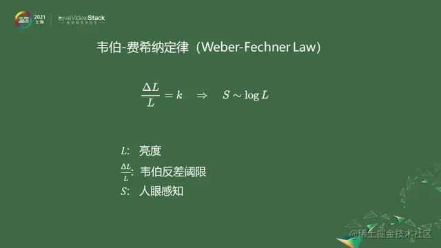 韦伯-费希纳定律表示人眼在很大的亮度范围内对光线响应是对数的。解一下方程就可知响应函数是对数的。根据实验韦伯定律在 1~1000 nit 的亮度下都符合得较好。根据定律就应该按照Log的规律记录亮度,这就是Log编码。