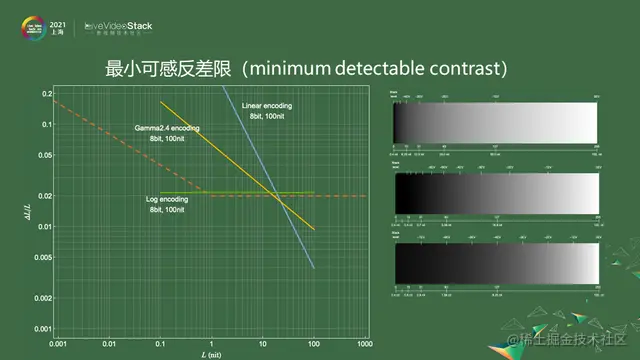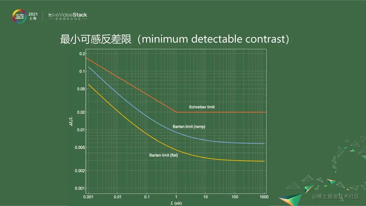 上图是把不同模型的「最小可感反差限」画到双对数坐标轴上。红色的是根据Schreiber实验数据做的简单模型,下面是Barten模型中取不同条件下的两条线,分别是ramp、flat,表示在不同条件下取的值。这个最小可感反差限这是一个强大的武器,我们可以用这个来评价编码设计好与否,看编码的效率。纵轴的Delta L可以看做是编码上变化 1 对应的真实亮度变化,只要Delta L比L的值小于这个最小可感反差限,人眼看起来就是过度平滑的。