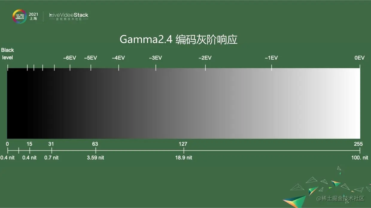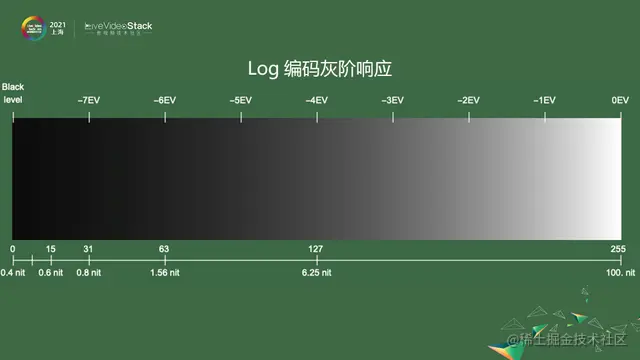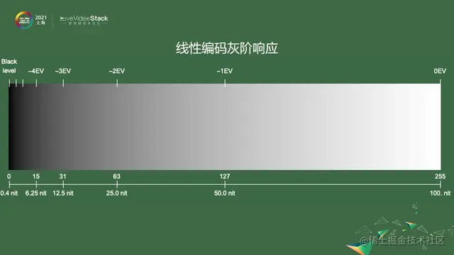 如果按照线性编码,1-255标,最下面行是实际亮度,从暗的黑点是0.4nit,最亮的100nit,100nit是SDR视频参考显示器的亮度。图片上端的EV是根据人眼对数特性做的标尺。如果按照线性的编码,数字大小就直接正比于亮度。可以看到上图的灰阶,会觉得不够均匀。比如从127到255跨了这么多码位,只表示了一档曝光,从127到63、63到31码位越来越少,仍然只表示一档曝光,对于暗部区域远远不够,对亮度来说表示得太细腻,不合理。