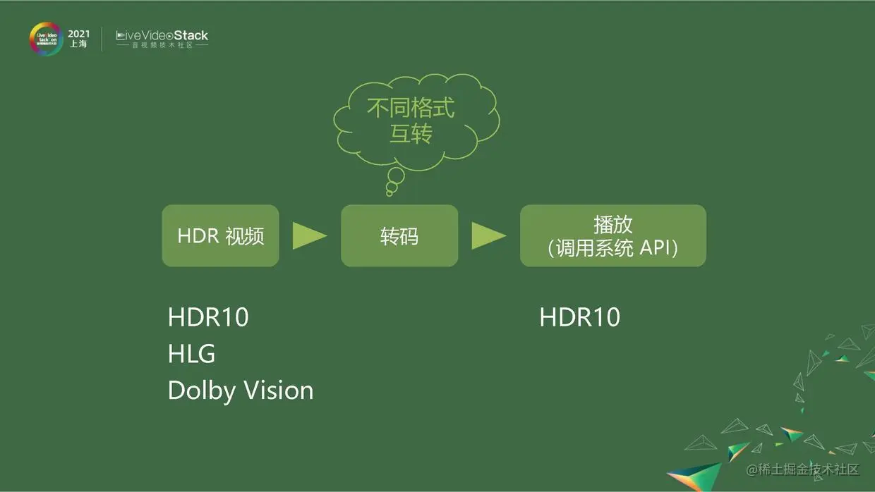 首先观众用户上传的HDR视频不是统一格式,我们在转码的环节进行统一,播放时会减少很多问题。上图中列了一些常见格式:HDR10、HLG、Dolby Vision等,还有其他标准格式,我们都在服务端转码的时候进行统一。