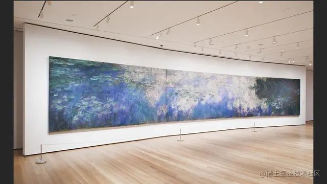 那是一种无法用言语表达的震撼,原来《睡莲》的原画是如此之大,十多米宽、两米高,有一面墙那么大,让所在的会场都放不下。原来在画册上细碎笔触并不细碎,一笔一划清清楚楚。原来原画的色彩如此生动鲜亮。然而在画册上看到的色彩总觉得有些灰蒙蒙的,有前辈对我解释说莫奈晚年罹患眼疾,所以色彩调得有些朦胧,可站在原画前发现不是这样,白的耀眼、红的热烈、蓝的深沉,还有不乏纯度很高的色彩混入其中,仿佛在发光。只是原画太大,将它印刷到画册上后颜色就混在一起,让人误以为是这样的风格。我在原画面前来回走动,每一个视角都仿佛在刷新我的认知,非常震撼。我被这些生动的颜色和热情的笔触所淹没,感受着那些从未在小小画册上体会到的情绪,让我流连忘返。这是第一个故事。