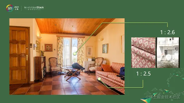 在这个场景中,将沙发和白墙局部截出来,单独看的话人眼觉得两块区域的反差差不多,但从绝对亮度上相差非常大。因为人眼不是线性的,是按倍数关系的,上图中沙发亮暗差1:2.5倍,白墙亮暗差1:2.6倍。比率差不多,人眼就会觉得亮暗程度差不多。