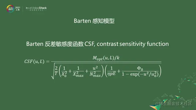 后面在此基础上做了更为复杂的Barten感知模型,更完整地描述了人眼对于不同亮度和空间的频率的响应情况。空间频率可以理解为细节程度,平坦的地方频域低,细节地方频域高。这个模型很复杂,感兴趣的话可以看一下paper原文。本次分享不考虑细节。