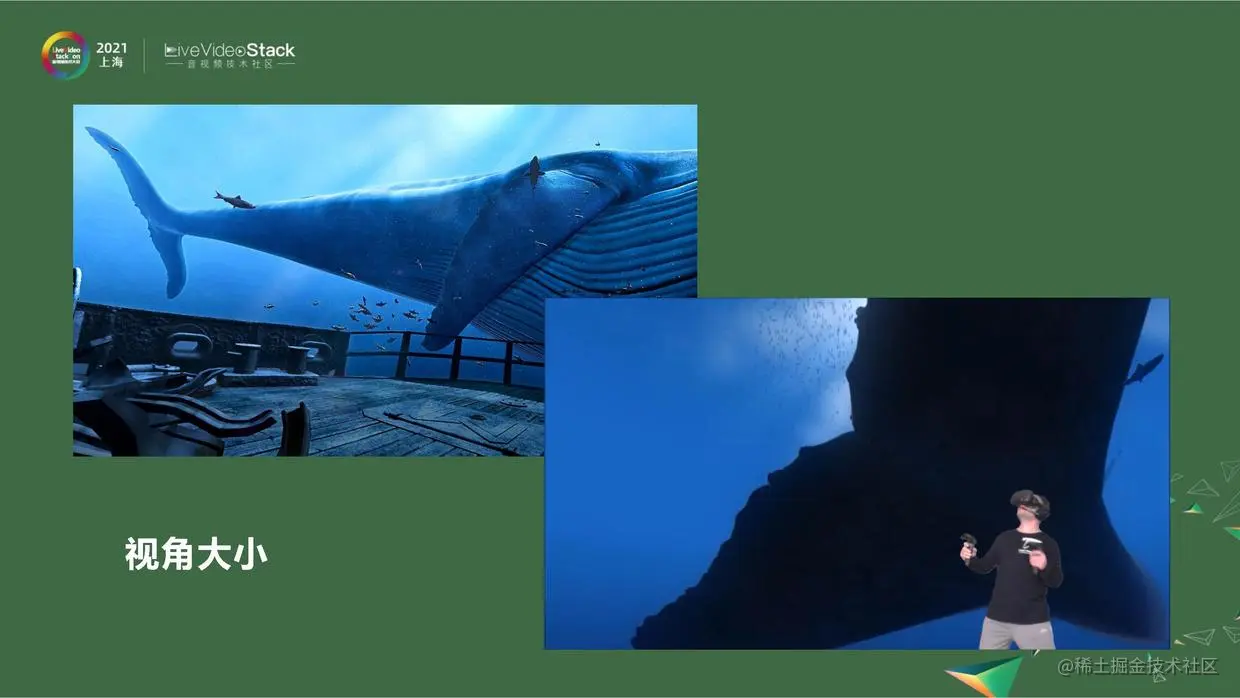 蓝鲸故事中,普通屏幕视角有限,无论是40寸或是100寸的电视始终是有限的。可是量变引起质变,当拥有了完全无限的屏幕,就可以达到无限制的享受。普通的屏幕承载不了《the Blue》这个VR作品中360 度环绕身体场景的信息量,也就营造不出那种强烈的压迫感,当在普通屏幕中蓝鲸尾巴拍下来时就只觉得一般了。而戴上头盔体验,临场感完全不一样。
