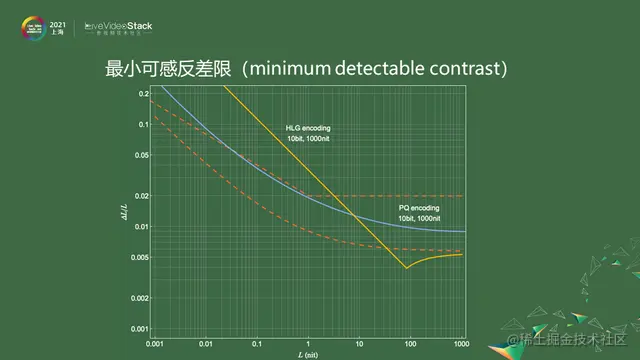 混合对数gamma好处是把对数编码与gamma编码相结合,在暗的地方用gamma编码,在亮的地方用对数编码,中间有过度,上图的曲线一开始是斜着的,慢慢变平,可以一直到1000nit。把这条曲线和Schreiber极限相比,暗的地方编码效率略显不够。