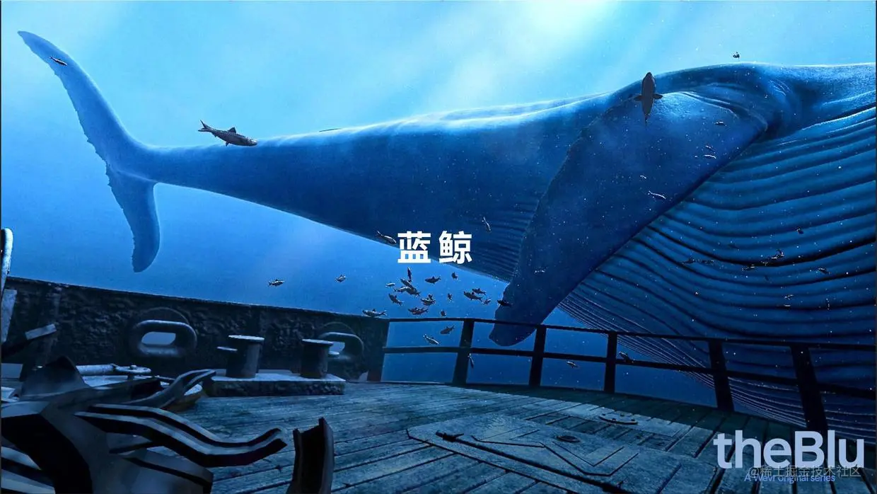 上图播放了YouTube搬运的游戏体验。屏幕上展示的是这个玩家看到的内容。很快会看到从背后冒出一条巨大的蓝鲸,巨大这个词已经很难描述我第一眼看到时候的震撼感受了,真的很大,大到要转头才能看全。那种栩栩如生、进而产生那种强烈的压迫感真的吓了我一跳。随着蓝鲸继续往上游,它巨大的尾巴甩过来,好像真的要甩到我脸上,我明明知道这是个VR的艺术作品,但我还是下意识坐地上躲避。这就是当视角从有限的屏幕拓展到无限的屏幕时,同样的东西所带来的感觉就会完全不一样,太震撼了。