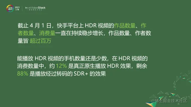 截止4月1日,在快手平台上,HDR视频的作品数量、作者数量、消费量都在稳步增长。从实际用户数据中可以发现目前为止能够播放HDR视频的手机数量还是少数,在消费数量中12%是真正原生播放HDR效果,剩余88%播放结果转码的是SDR+的效果。但是随着硬件器材的更新换代,越来越多的设备将支持HDR视频播放。