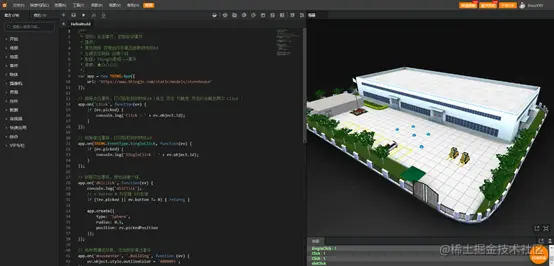 实际应用一下,在数字孪生可视化场景中创建鼠标单击事件,打印拾取到的物体id;鼠标双击事件,原地创建个球;并给所有建筑对象添加鼠标滑过事件。