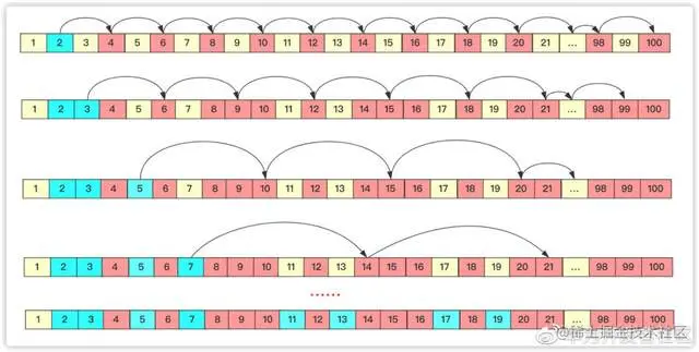 假设刚开始全是素数,2 为素数,那么 2 的倍数均不是素数;然后遍历到 3,3 的倍数标记一下;下个是 5(因为 4 已经被标记过);一直到 n-1 为止。具体流程可以看图: