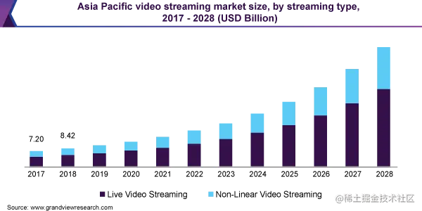 今年2月份,美国知名调查机构Grand View Research发布了一份调查报告,报告中显示,2020 年全球视频流媒体市场规模为 501.1 亿美元。预计2021~2028年,每年将会以21%的复合增长率持续增长。疫情无疑是这种爆发式增长背后的主要推动力量。
