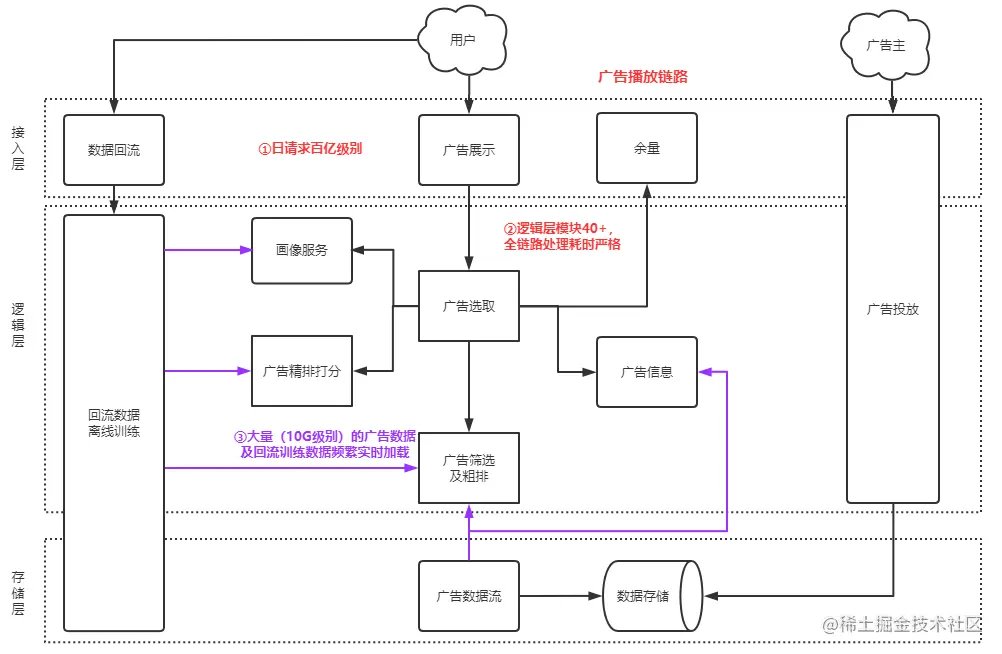 链路拓扑复杂及性能压力极大,整个播放链路涉及40+的细分模块。在100~200毫秒(不同流量要求有差异)的极短时间内,需要访问所有模块,计算出一个最好的广告。