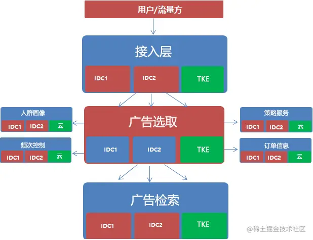 腾讯广告承载了整个腾讯的广告流量,并且接入了外部联盟的请求,在所有流量日益增大的场景下,流量突增后如何快速调配资源甚至自动调度,都成为了广告团队所需要考虑的问题。尤其是今年整体广告架构(投放、播放)的条带化容灾优化,对于按需分配资源、按区域分配资源等功能都有着更强的依赖。 在广告内部,播放流系统承载了整个广告播出的功能,这里的稳定性直接决定了整个腾讯广告的收入,以下为架构图: