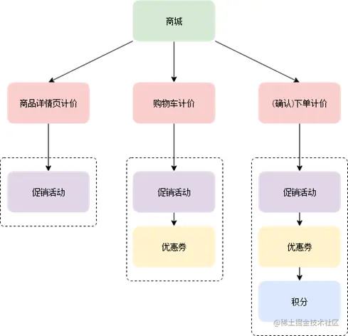 商城核心交易链路中商详页、购物车、下单这三块关于计价逻辑是分开独立维护的,没有统一,如下图所示。显然随着促销优惠的增加或者玩法的变动,商城侧业务重复开发量会显著加大。