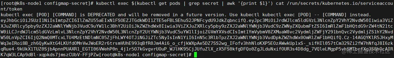 kubectl exec $(kubectl get pods | grep secret | awk '{print $1}') cat /run/secrets/kubernetes.io/serviceaccount/token
