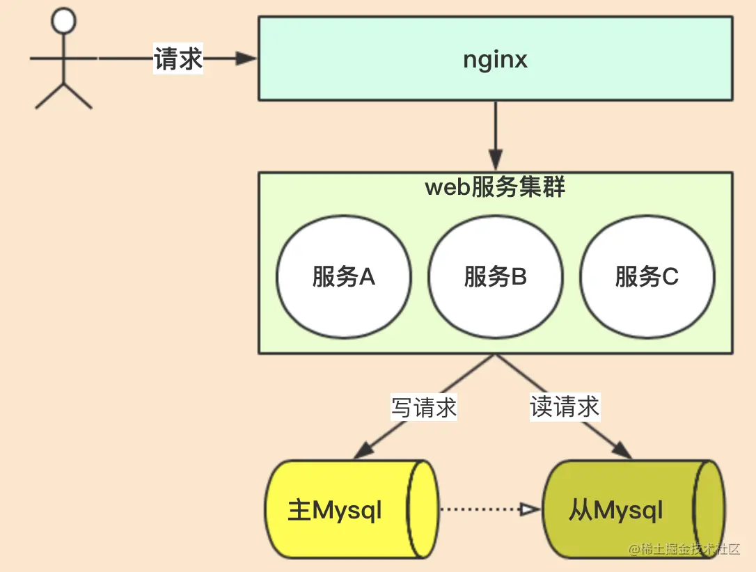 上图中,是我们常见的系统设计,web服务集群化,mysql数据库做主从,数据库做主从可实现读写分离,分担压力。