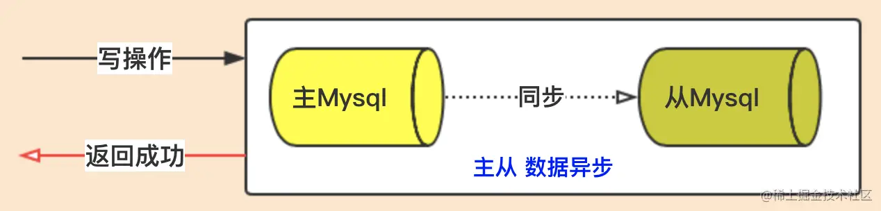 写请求把用户姓名【张三】改为【李四】,写请求写入主Mysql成功后,系统就直接返回成功;然后再通过主Mysql的binlog日志方式把数据同步到从Mysql。