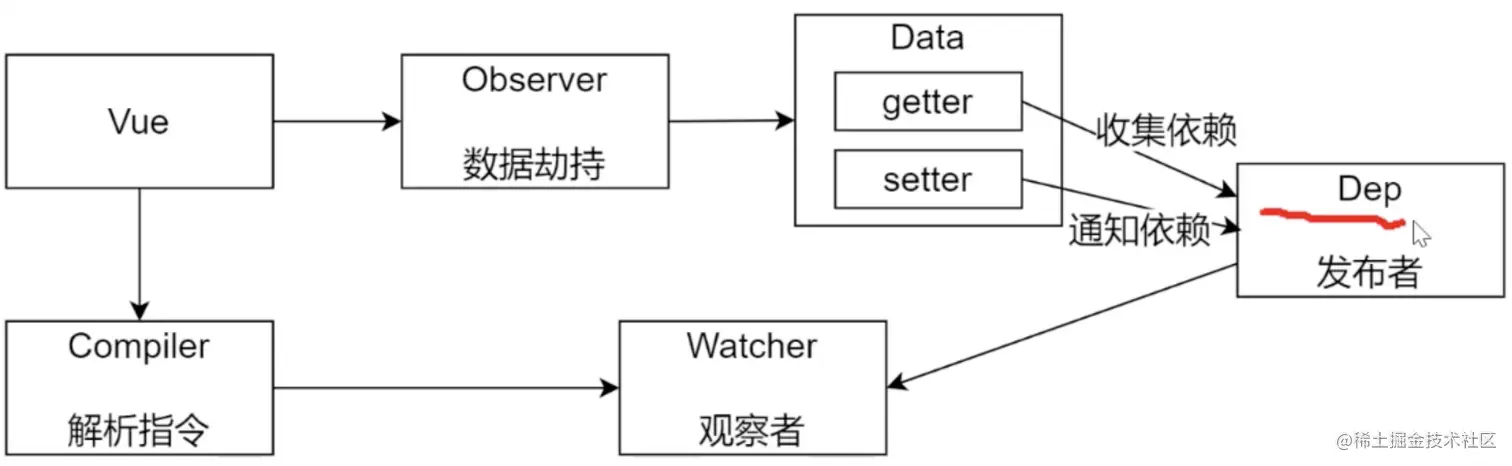 - 当数据变化触发依赖, dep 通知所有的 Watcher 实例更新视图