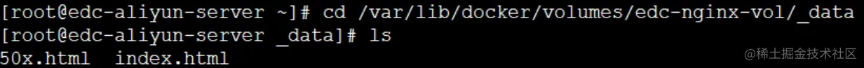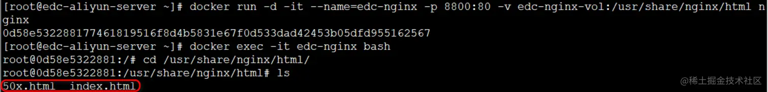 其中,-v代表挂载数据卷,这里使用自定数据卷edc-nginx-vol,并且将数据卷挂载到 /usr/share/nginx/html (这个目录是yum安装nginx的默认网页目录)。