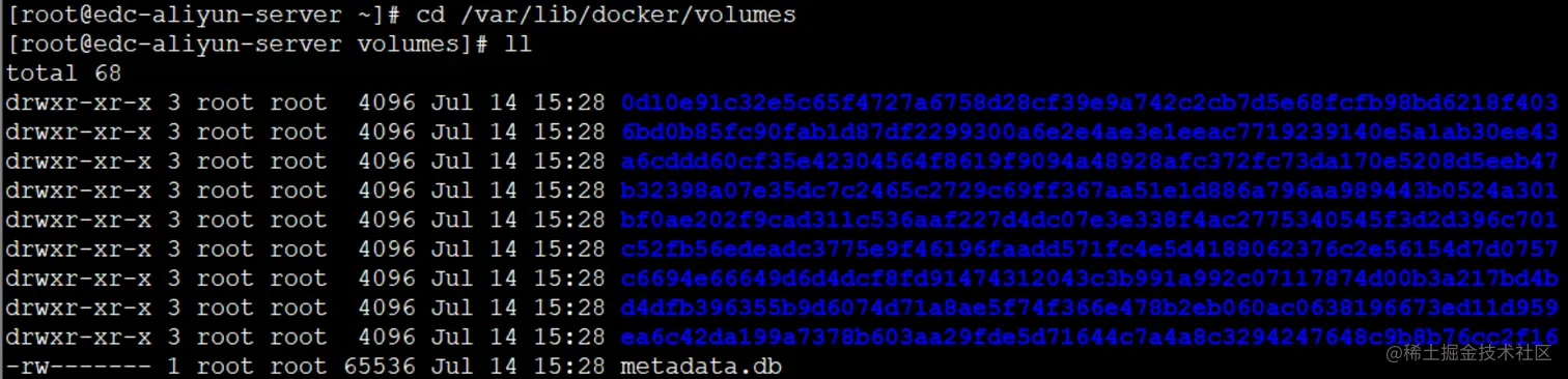 由上图可以知道,目前所有Container的数据都保存在了这个目录下边,由于没有在创建时指定卷,所以Docker帮我们默认创建许多匿名(就上面这一堆很长ID的名字)卷。