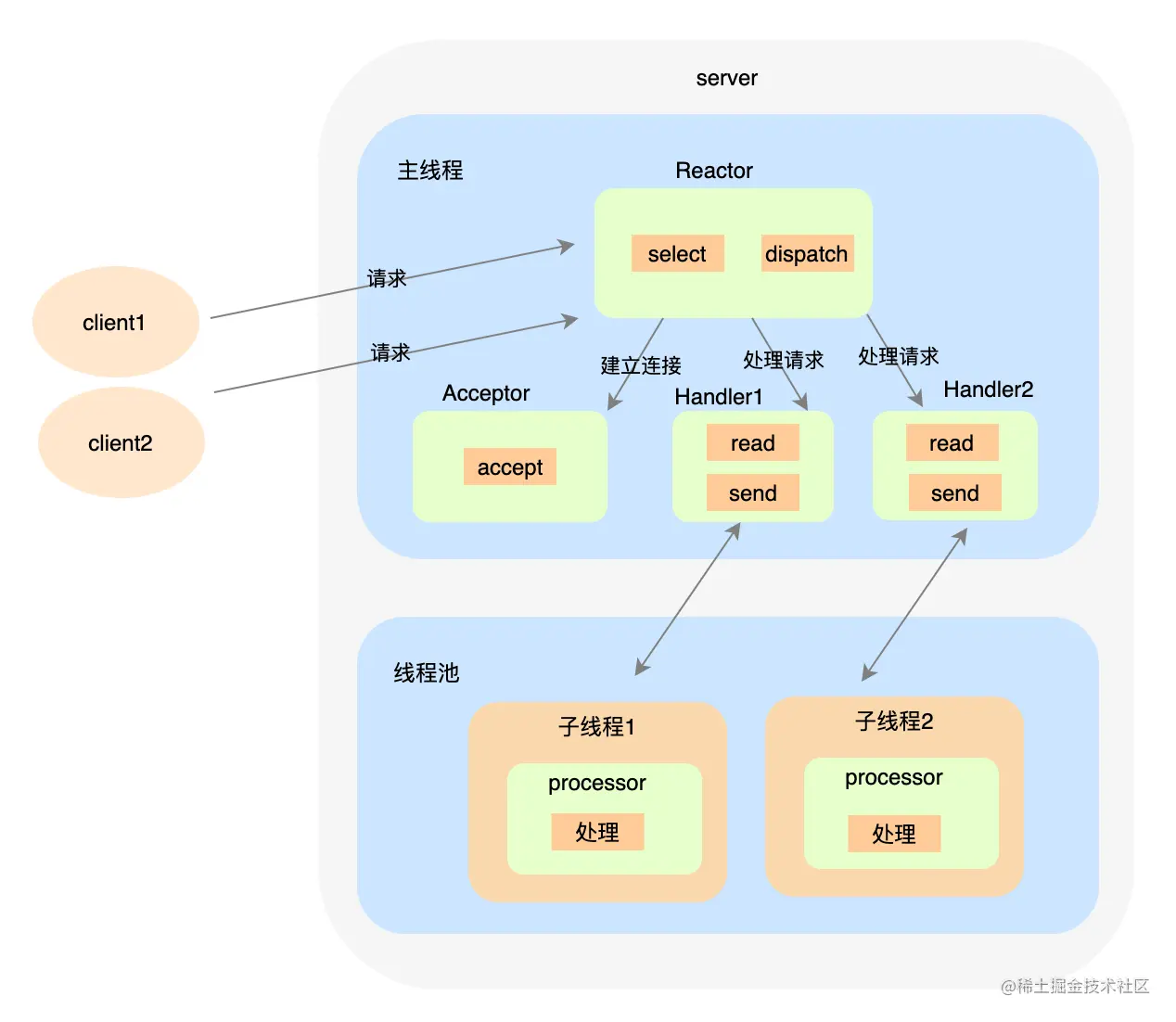 Reactor 对象通过 select 监控连接事件,收到事件后通过 dispatch 进行分发。