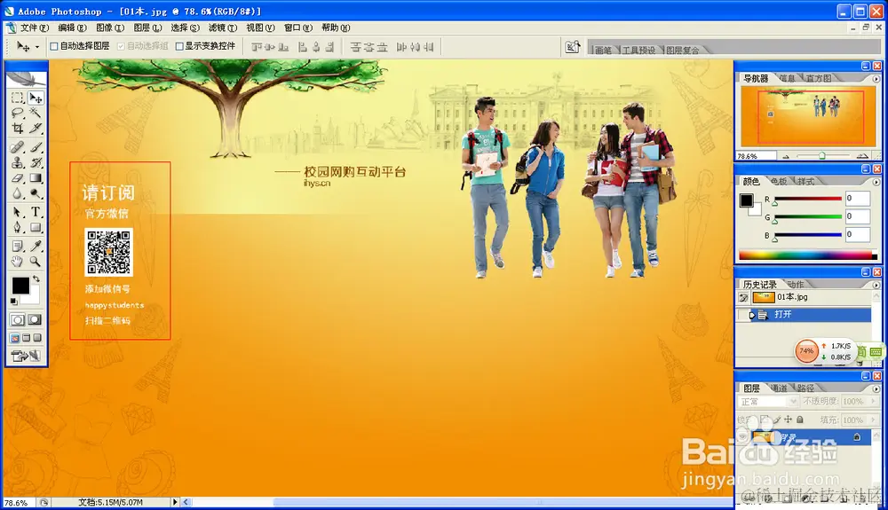 如何在微博首页放置一个二维码? 孙叫兽 2021-06-28 187 阅读1分钟 首先用photoshop打开作为微博背景的图片,还有二维码图片。 然后将二维码图片整合到背景图片的适当位置,并编写相关说明,如下图。 然后将图片保存到桌面。 打开微博,可以看到左侧现在是没有二维码的