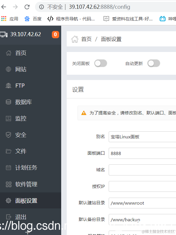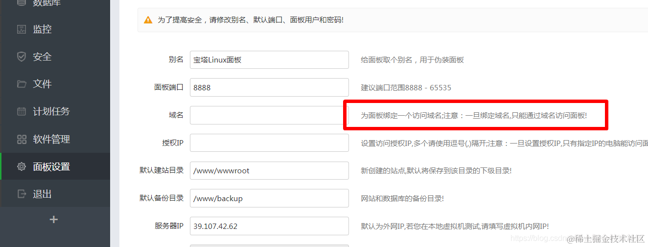 宝塔面板绑定域名导致无法访问 孙叫兽 2021-06-28 580 阅读1分钟 用这个命令rm -f /www/server/panel/data/domain.conf删除绑定域名后, 就能用ip+端口进入面板了,以后还是不要绑定域名了 主要是因为我手残。 看重点,我是绑定了域名,用域名也无法访问。 现在终于进去啦