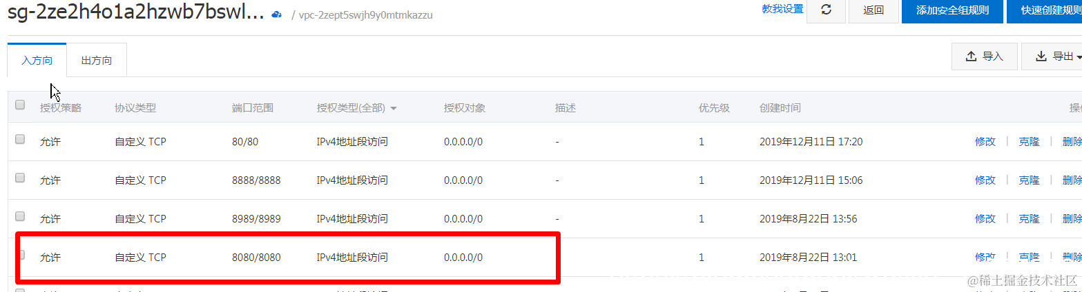 宝塔访问域名访问不到 孙叫兽 2021-06-28 371 阅读1分钟 首先说明一点,我这个问题不是宝塔面板绑定域名的那种情况。 浏览器输入域名会报上面的错误,经过各种尝试,发现是安全组没有放开,在阿里云控制台添加一个80/80的通用安全组规则即可,知道上行和下行的区别,打开上行规则即可。 这样再次访问就可以啦。 前提是保证你那个宝塔的基本配置是没有问题的前提下。 这个你可以参考别人的教程