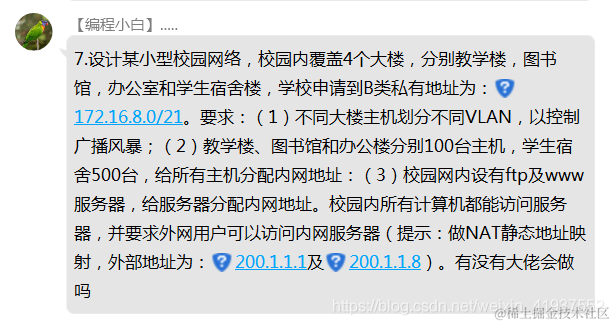 设计某小型校园网络,校园内覆盖4个大楼,分别教学楼,图书馆,办公室和学生宿舍楼,学校申请到B类私有地址为:172.16.8.0/21。要求:(1)不同大楼主机划分不同VLAN,以控制广播风暴;(2)教学楼、图书馆和办公楼分别100台主机,学生宿舍500台,给所有主机分配内网地址:(3)校园网内设有ftp及www服务器,给服务器分配内网地址。校园内所有计算机都能访问服务器,并要求外网用户可以访问内网服务器(提示:做NAT静态地址映射,外部地址为:200.1.1.1及200.1.1.8)。有没有大佬会做吗?