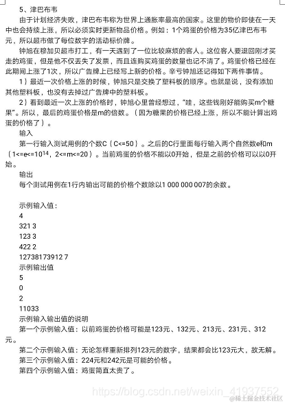 第一行输入测试用例的个数C(C<=50)。之后的C行里面每行输入两个自然数e和m(1<=e<=1014,2<=m<=20)。当前鸡蛋的价格不能以0开始&