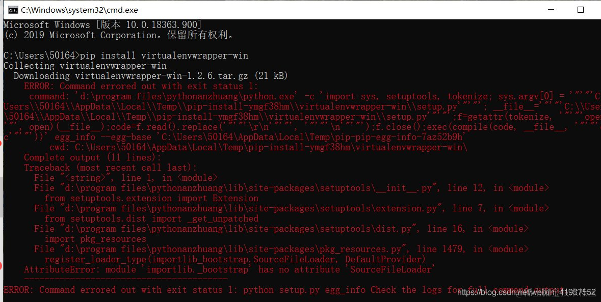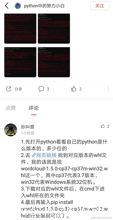 Python在cmd中配置虚拟环境ERROR: Command errored out with exit status 1: 孙叫兽 2021-06-28 158 阅读1分钟 粉丝求助: 解决办法: 具体步骤: 1.查看Python版本 2.Pythonlibs 中找到对应版本的whl文件,cp37代表3.7版本,win32代表Windows系统32位机,根据自己的电脑位数选择。