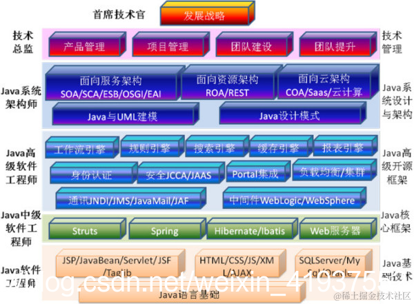 怎么样才算高级java工程师 孙叫兽 2021-06-28 95 阅读1分钟 高级水平: 1.能对需求进行架构设计,选择框架以适应最合适的业务,作为某个项目的领导,带领团队完成项目。 2.有自己的开源项目,可以写出自己的组件,对开源的框架能够进行二次编写,java核心技术有着非常深入的理解 架构师 能管理多个高级工程师及以下级别,提升工作效率 其发展战略可以参考下图: