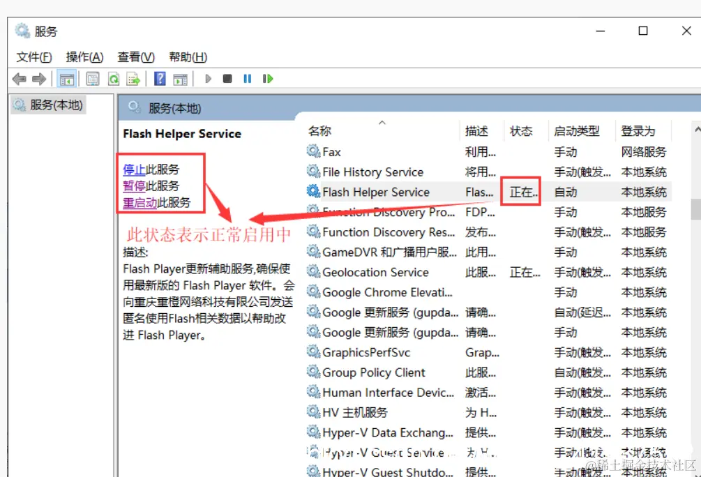 3.弹出服务的界面,找到“Flash Helper Service”如图: