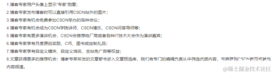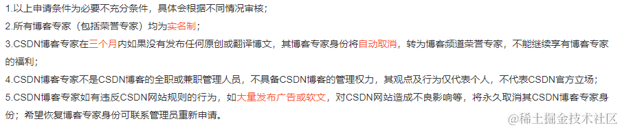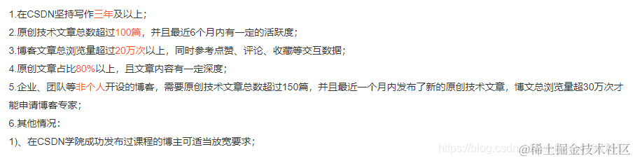 CSDN博客专家申请的条件及规则 孙叫兽 2021-06-28 165 阅读1分钟 “博客专家”是CSDN给予质量较高、影响力较大的IT类博客的荣誉称号,代表了CSDN官方对其博客的肯定,同时博客专家也需要承担一定的社区责任。 申请规则:blog.csdn.net/experts/rul… 申请地址:blog.csdn.net/experts/app… 申请条件: 注意事项: 专属福利: 申请表: 提交成功: