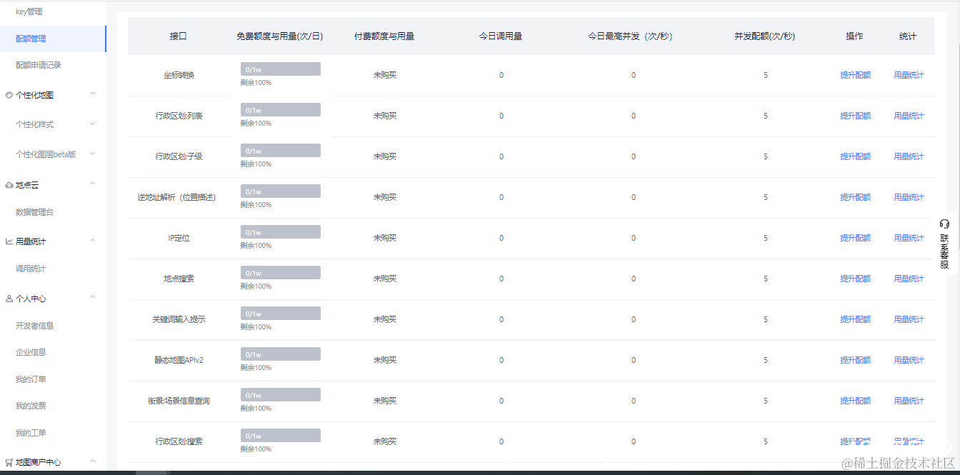 当然,我们也可以查看用量统计,根据日期及key以及服务就可以检索,提升配额请参考:lbs.qq.com/service/web…