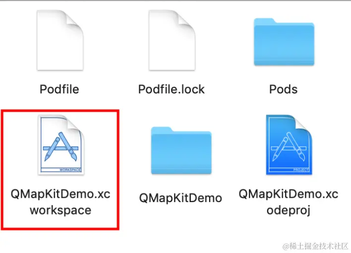 命令执行成功后,会生成 .xcworkspace 文件,打开.xcworkspace 文件以启动工程(注意:此时不能同时开启.xcodeproj文件,示例: