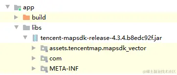 以4.3.4版本的地图功能为例,解压后,得到一个 libs文件夹,该文件夹中包含tencent-mapsdk-release-4.3.4.b8edc92f.jar文件和一个jniLibs文件夹(文件中包含所有的so库文件) - 将 libs 目录下的"*.jar"文件拷贝到 AndroidStudio 项目对应的 app/libs/ 文件夹下。