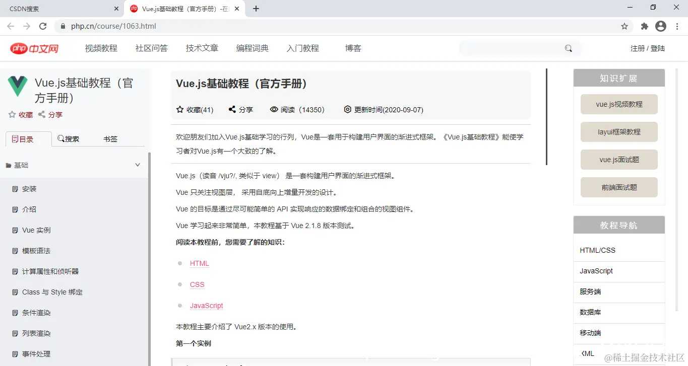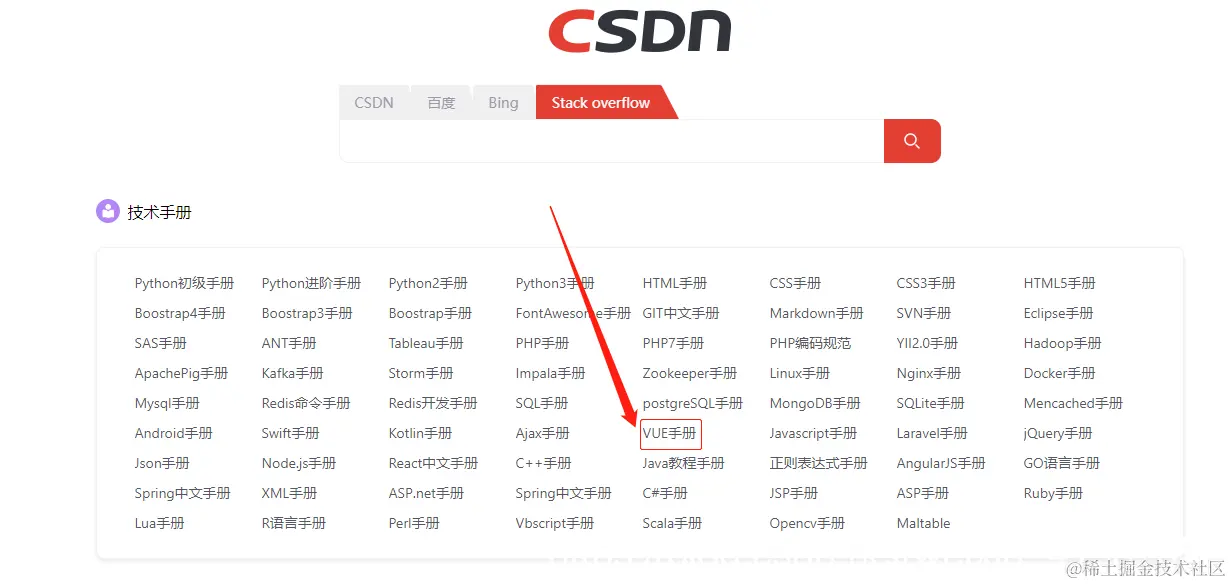 比如,我们找vue相关知识点,点击vue手册即可跳到对应的官网。