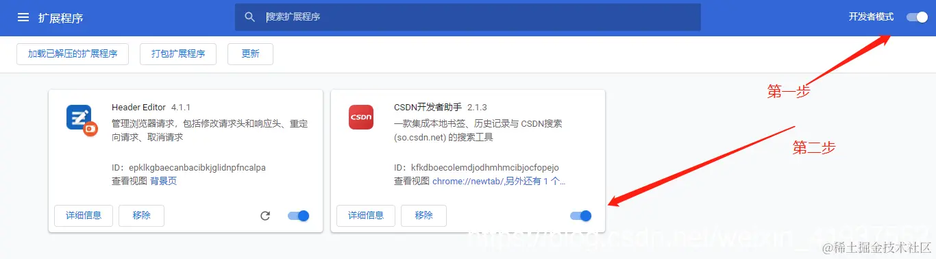 浏览器输入地址“ chrome://extensions/ ”进入扩展程序页面,开启开发者模式