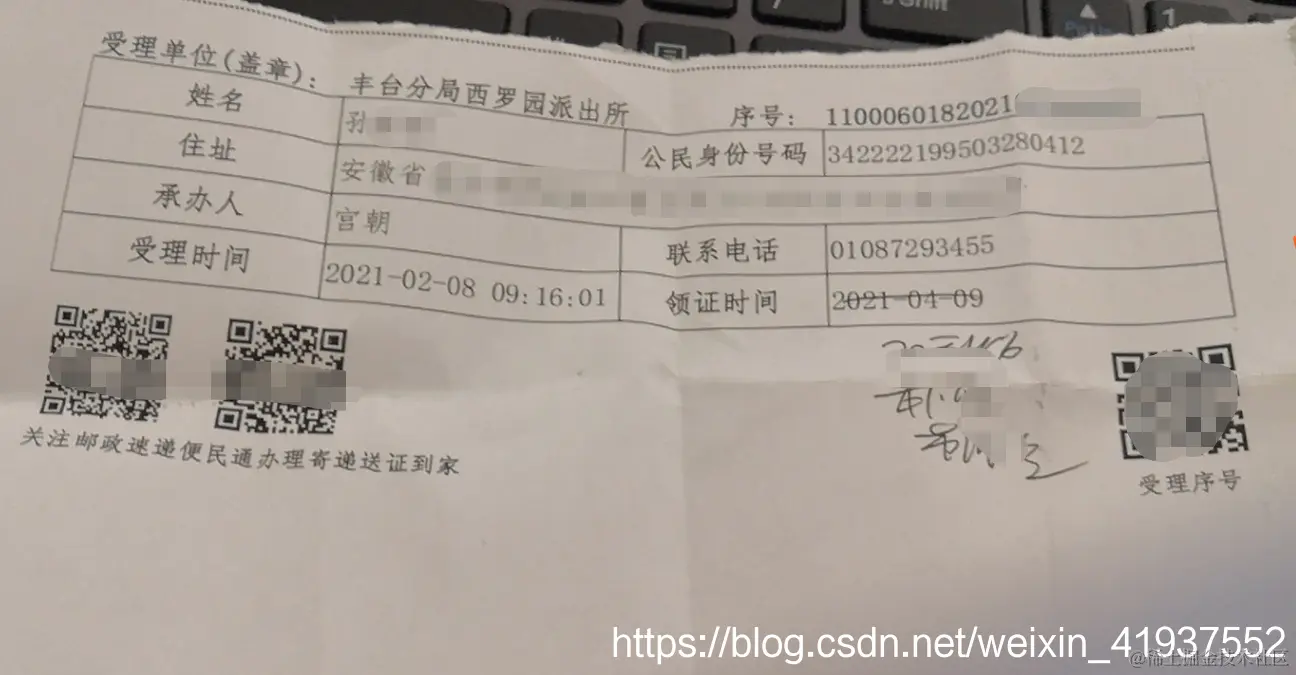 然后直接把身份证给业务员,让她给我拍个帅照,留个电话和现住地址,签字,给他20个大洋即可,我们拿了自己的身份证和回执单就可以回去啦,20天后再拿着身份证和回执单去领取即可,人很少,就花了3分钟搞定。